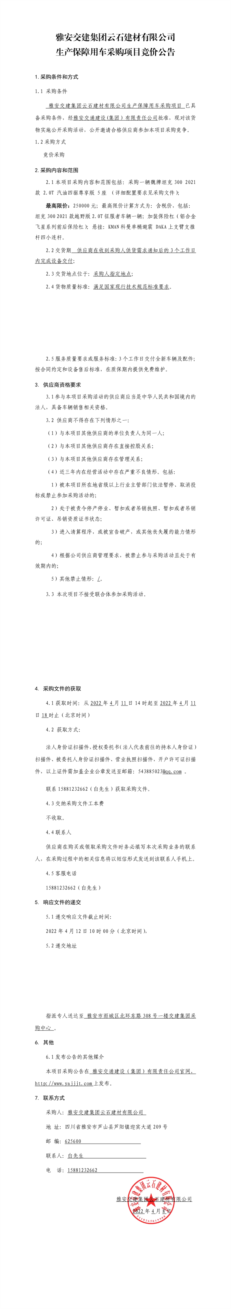 雅安交建集團(tuán)云石建材有限公司生產(chǎn)保障用車采購(gòu)項(xiàng)目競(jìng)價(jià)公告