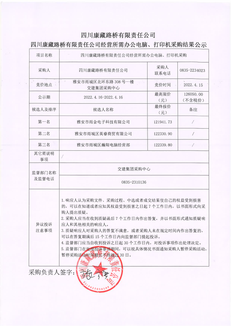 四川康藏路橋有限責(zé)任公司經(jīng)營(yíng)所需辦公電腦、打印機(jī)采購(gòu)結(jié)果公示
