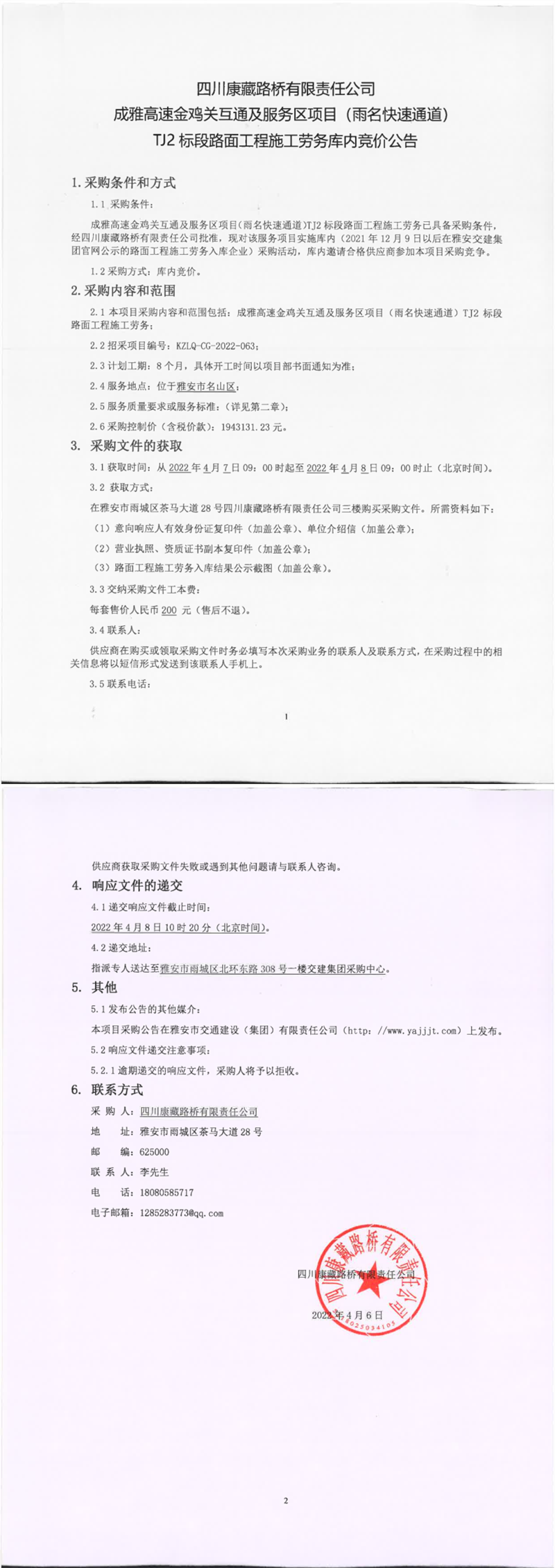四川康藏路橋有限責(zé)任公司成雅高速金雞關(guān)互通及服務(wù)區(qū)項目(雨名快速通道)TJ2標(biāo)段路面工程施工勞務(wù)庫內(nèi)競價公告
