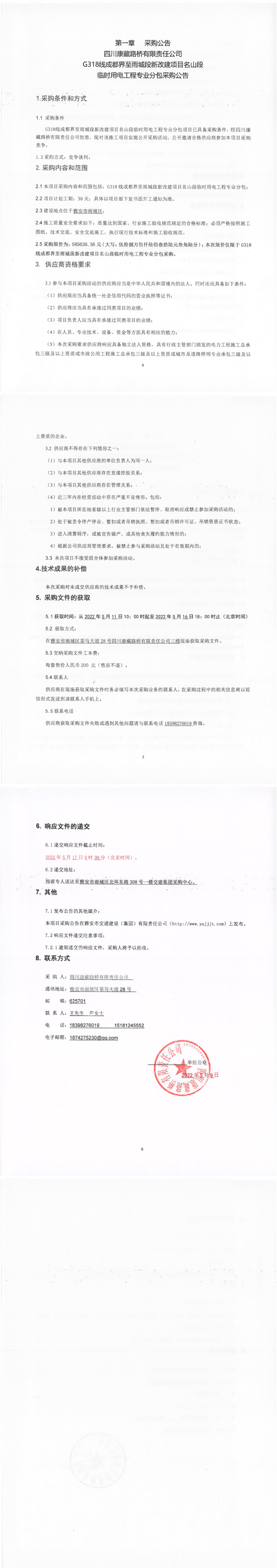 四川康藏路橋有限責(zé)任公司G318線(xiàn)成都界至雨城段新改建項(xiàng)目名山段臨時(shí)用電工程專(zhuān)業(yè)分包采購(gòu)公告