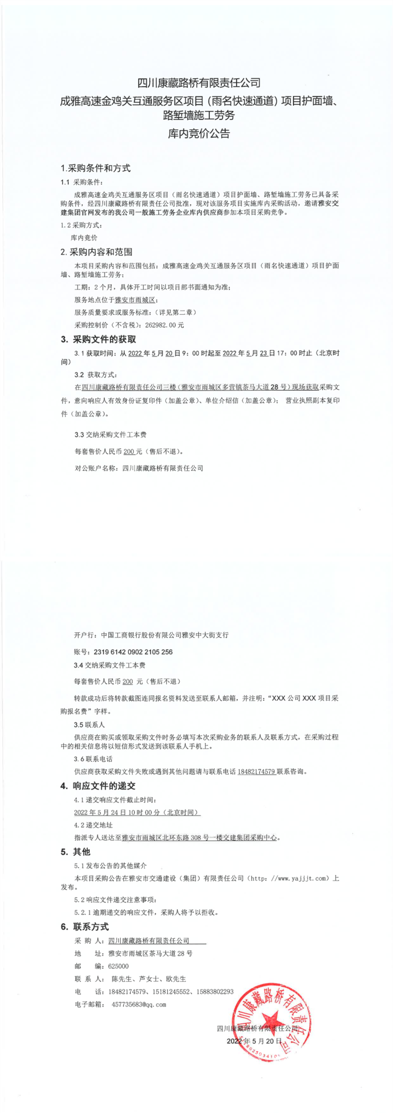 四川康藏路橋有限責任公司成雅高速金雞關(guān)互通服務(wù)區(qū)項目(雨名快速通道)項目護面墻、路塹墻施工勞務(wù)庫內(nèi)競價公告