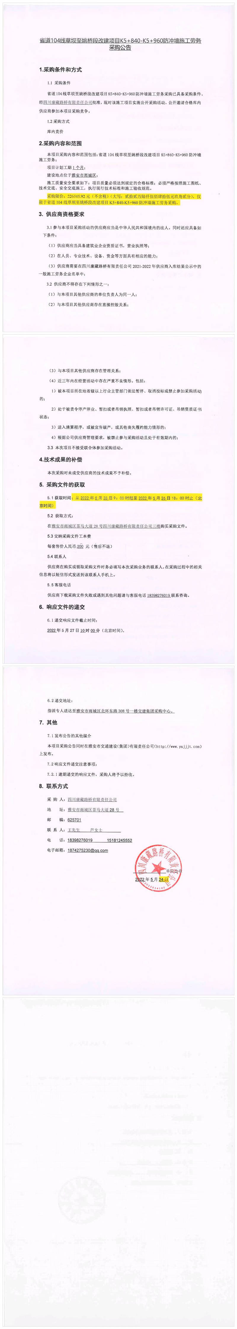 四川康藏路橋有限責(zé)任公司省道104線草壩至姚橋段改建項(xiàng)目K5+840-K5+960防沖墻施工勞務(wù)采購公告