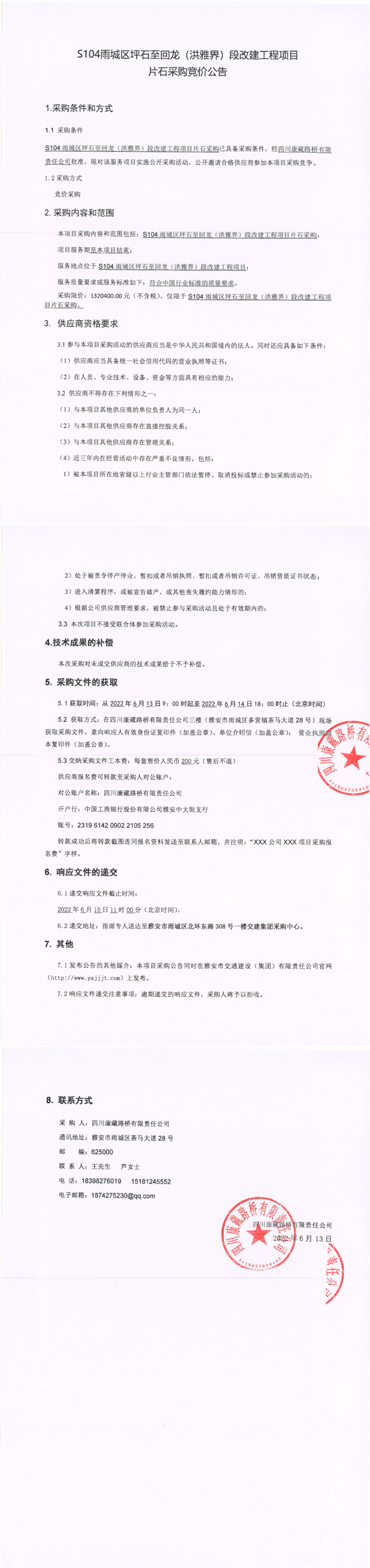 四川康藏路橋有限責任公司S104雨城區(qū)坪石至回龍(洪雅界)段改建工程項目片石采購競價公告