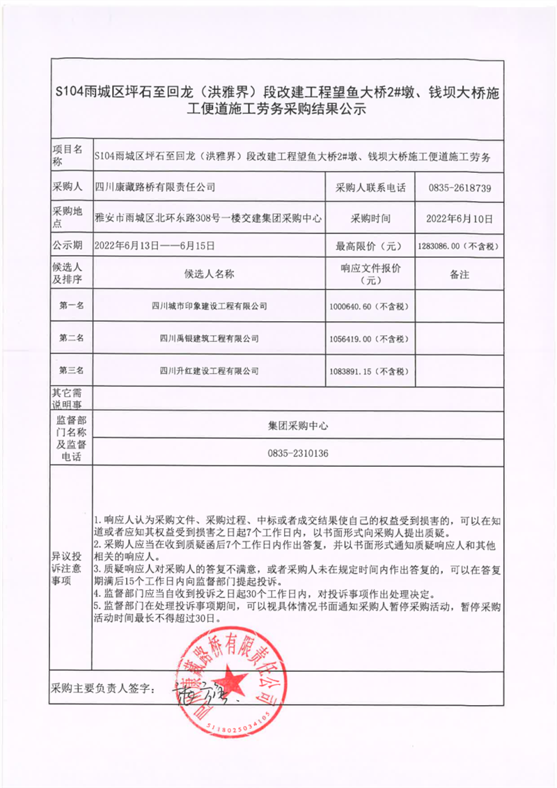 四川康藏路橋有限責(zé)任公司S104雨城區(qū)坪石至回龍(洪雅界)段改建工程望魚(yú)大橋2#墩、錢壩大橋施工便道施工勞務(wù)采購(gòu)結(jié)果公示