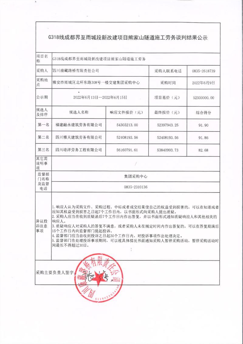 四川康藏路橋有限責任公司G318線成都界至雨城段新改建項目熊家山隧道施工勞務(wù)談判結(jié)果公示