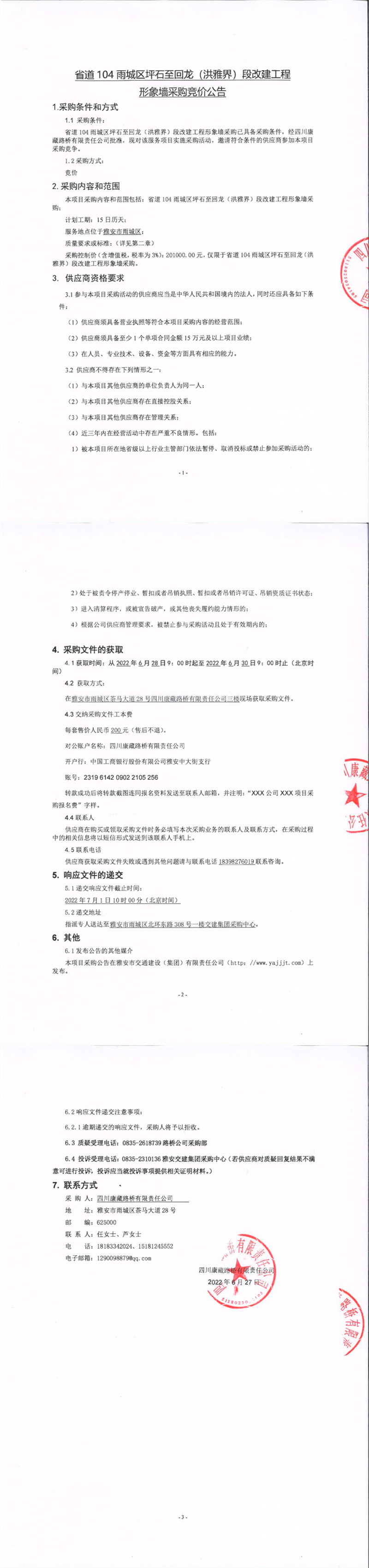 四川康藏路橋有限責任公司省道104雨城區(qū)坪石至回龍(洪雅界)段改建工程形象墻采購競價公告