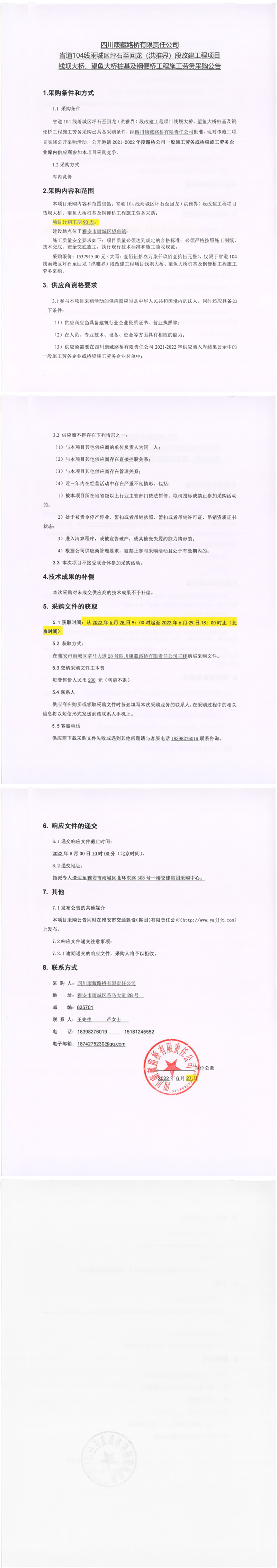 四川康藏路橋有限責(zé)任公司G318項(xiàng)目名山河大橋下部工程、皇茶大道天橋項(xiàng)目施工勞務(wù)采購(第二次)競爭談判采購結(jié)果公示
