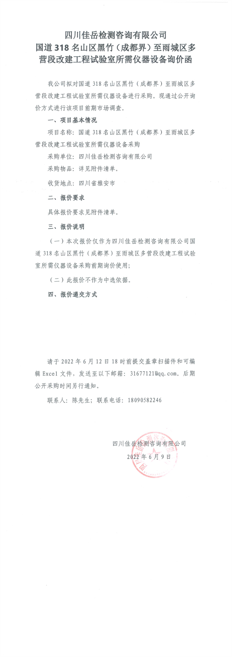 四川佳岳檢測咨詢有限公司國道318名山區(qū)黑竹(成都界)至雨城區(qū)多營段改建工程試驗(yàn)室所需儀器設(shè)備詢價函