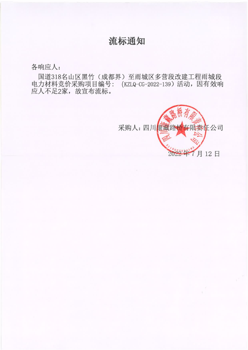 四川康藏路橋有限責(zé)任公司國道318名山區(qū)黑竹(成都界)至雨城區(qū)多營段改建工程雨城段電力材料競價采購項目流標(biāo)通知