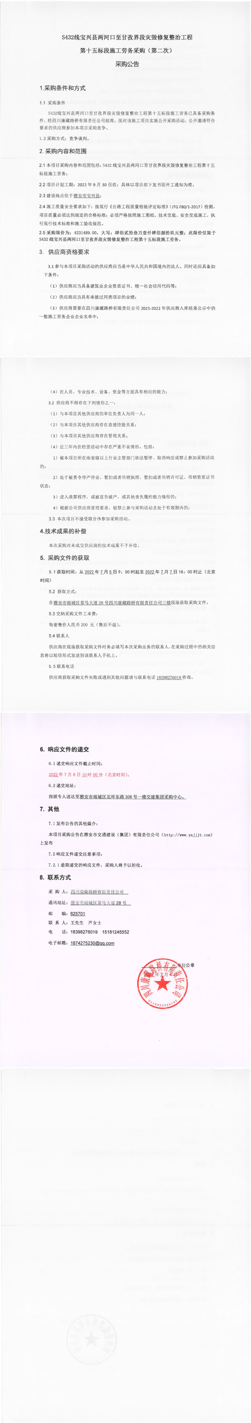 四川康藏路橋有限責(zé)任公司S432線寶興縣兩河口至甘孜界段災(zāi)毀修復(fù)整治工程第十五標(biāo)段施工勞務(wù)采購(gòu)(第二次)采購(gòu)公告
