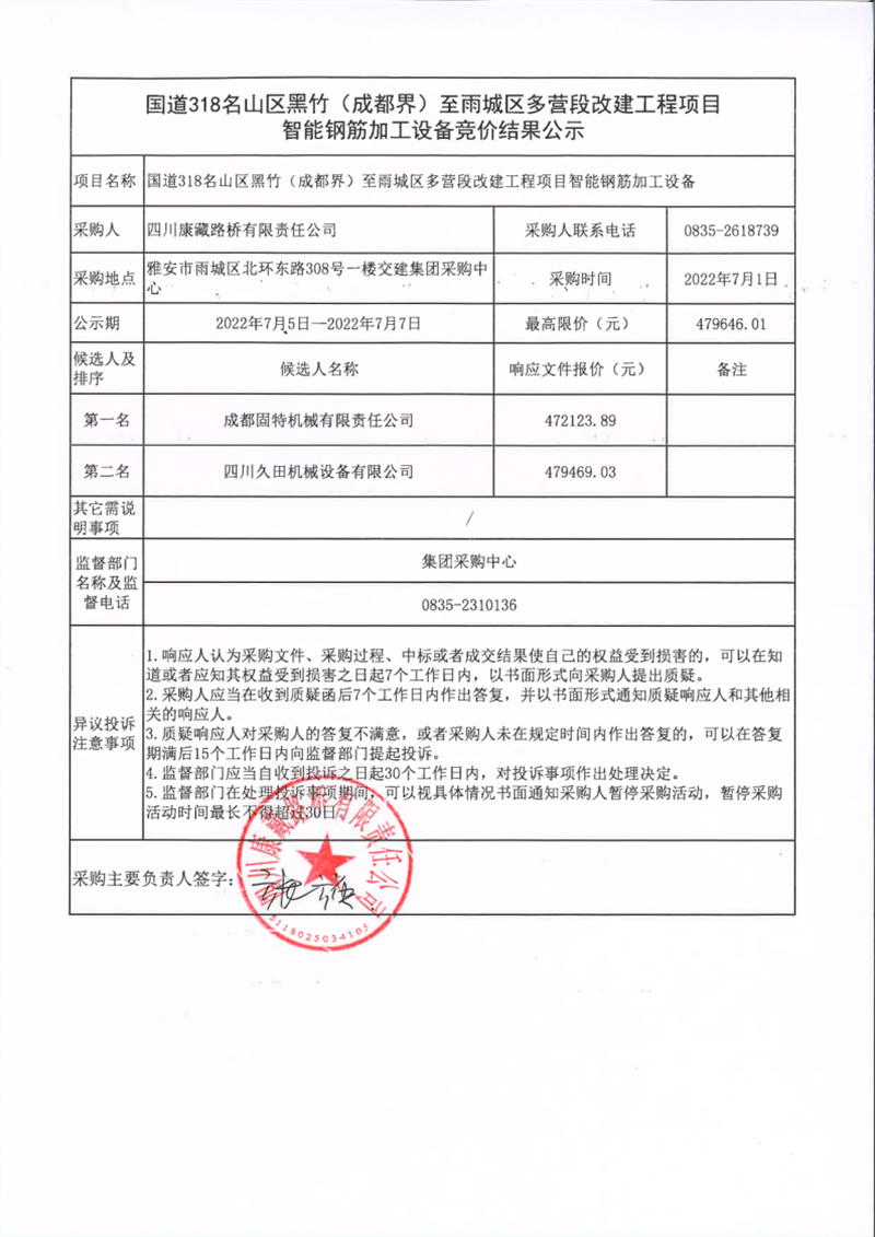 四川康藏路橋有限責任公司國道318名山區(qū)黑竹(成都界)至雨城區(qū)多營段改建工程智能鋼筋加工設(shè)備競價結(jié)果公示