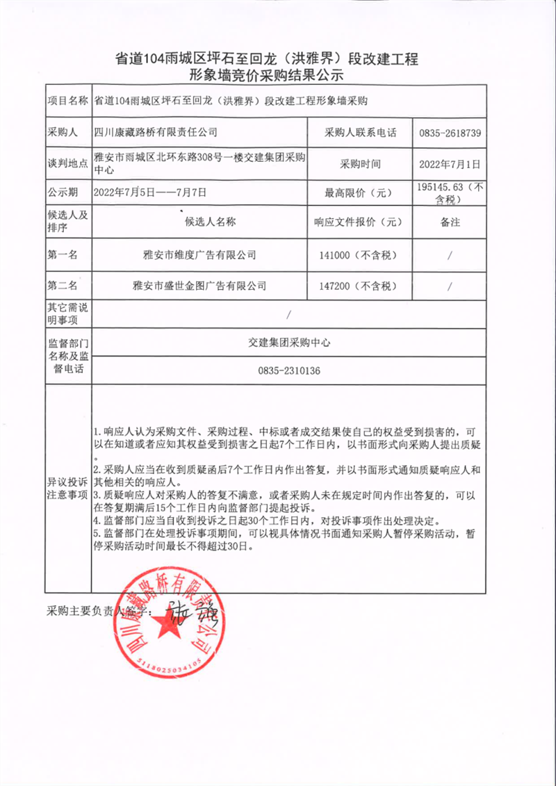 四川康藏路橋有限責任公司省道104雨城區(qū)坪石至回龍(洪雅界)段改建工程形象墻競價采購結果公示