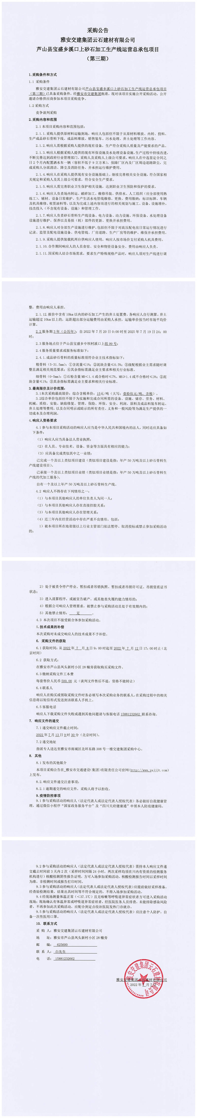 雅安交建集團云石建材有限公司蘆山縣寶盛鄉(xiāng)溪口上砂石加工生產(chǎn)線運營總承包項目(第三期)采購公告