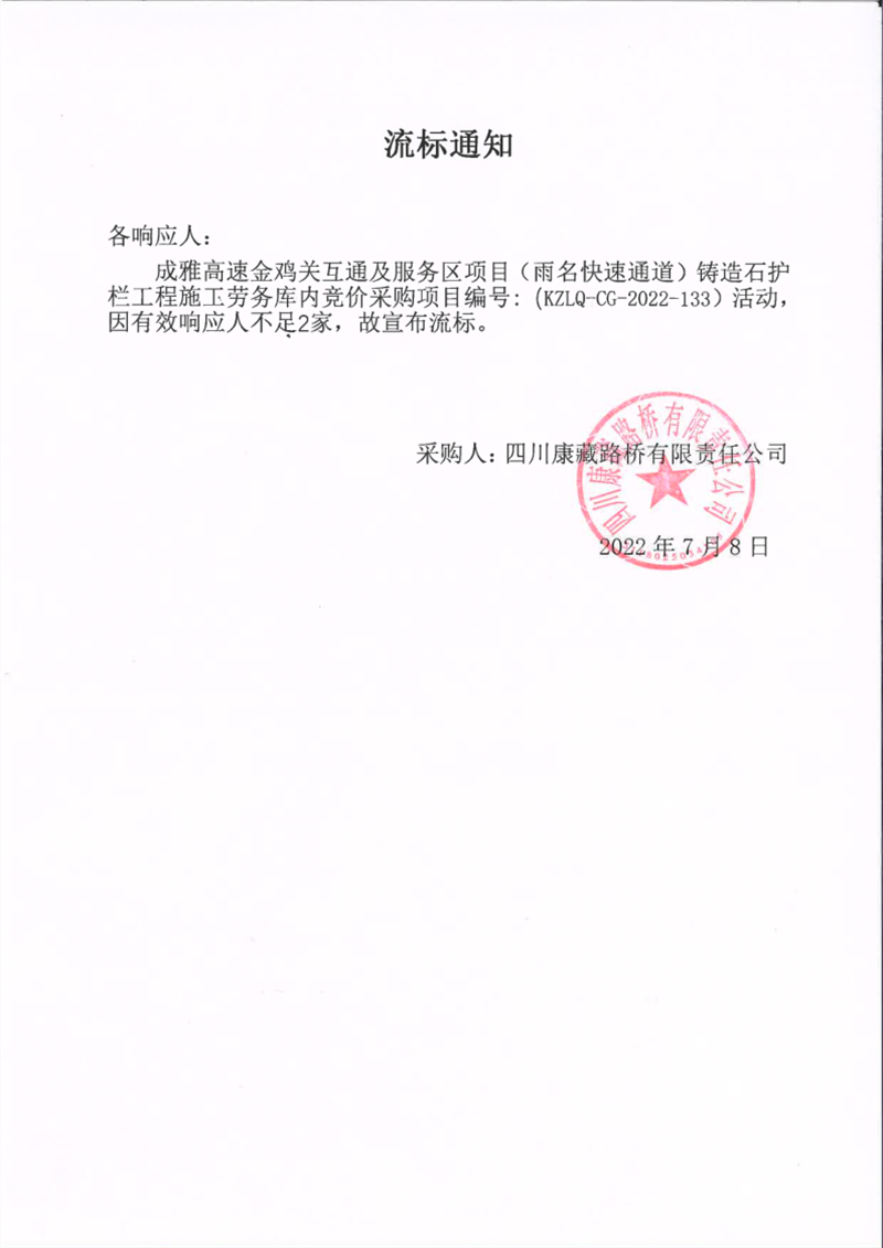 四川康藏路橋有限責(zé)任公司成雅高速金雞關(guān)互通及服務(wù)區(qū)項目(雨名快速通道)鑄造石護(hù)欄施工勞務(wù)庫內(nèi)競價采購項目流標(biāo)通知