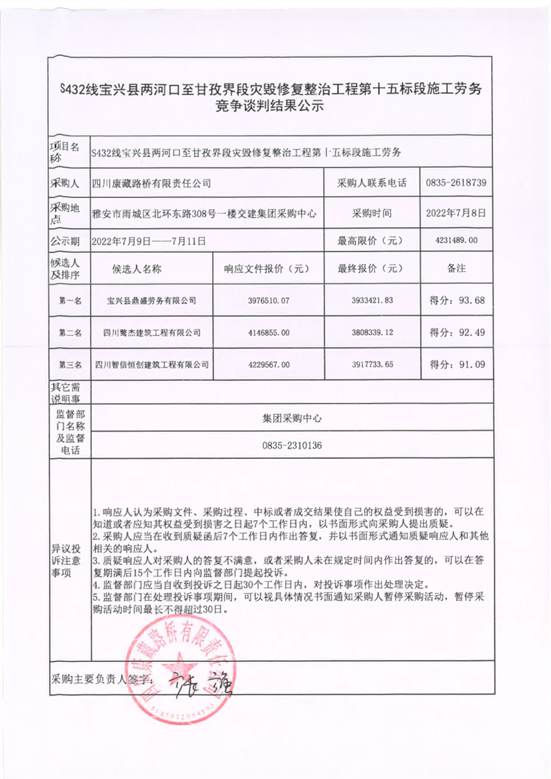 四川康藏路橋有限責(zé)任公司S432線寶興縣兩河口至甘孜界段災(zāi)毀修復(fù)整治工程第十五標(biāo)段施工勞務(wù)競(jìng)爭(zhēng)談判結(jié)果公示