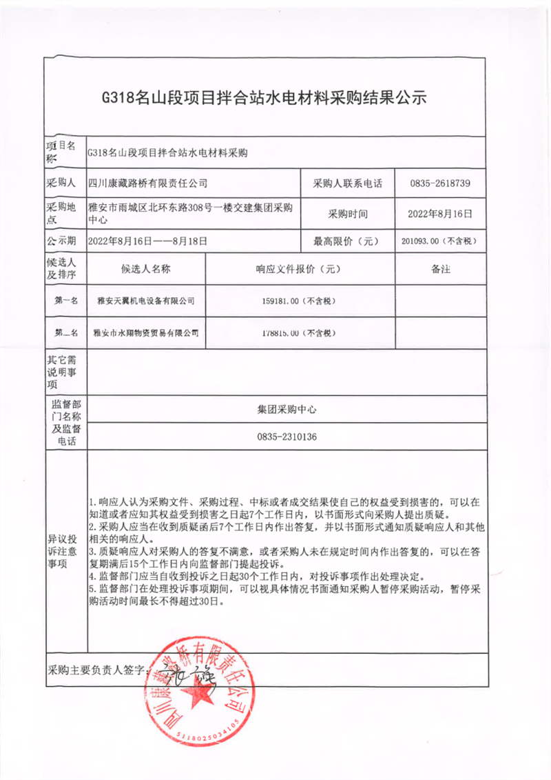 四川康藏路橋有限責(zé)任公司G318名山段項目拌合站水電材料采購結(jié)果公示