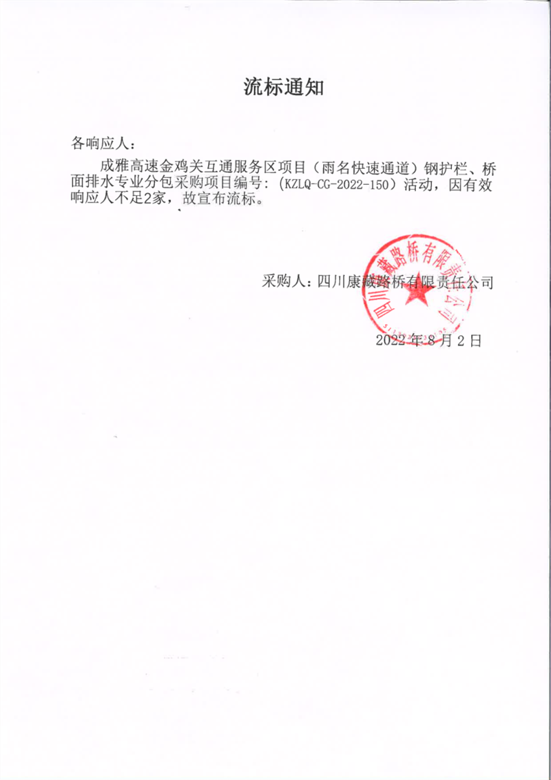 四川康藏路橋有限責任公司成雅高速金雞關互通服務區(qū)項目(雨名快速通道)鋼護欄、橋面排水專業(yè)分包采購項目流標通知