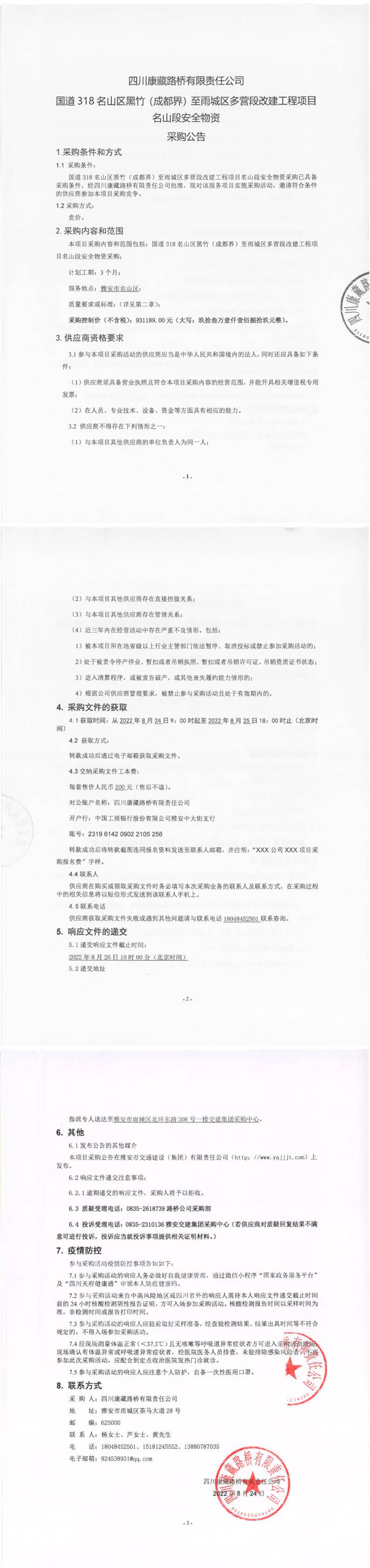 四川康藏路橋有限責(zé)任公司國(guó)道318名山區(qū)黑竹(成都界)至雨城區(qū)多營(yíng)段改建工程項(xiàng)目名山段安全物資采購公告