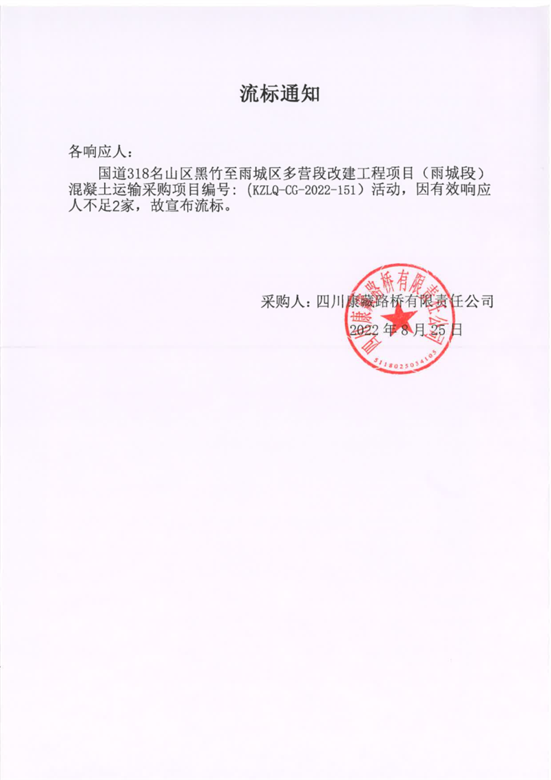 四川康藏路橋有限責(zé)任公司國(guó)道318名山區(qū)黑竹至雨城區(qū)多營(yíng)段改建工程項(xiàng)目(雨城段)混凝土運(yùn)輸采購(gòu)項(xiàng)目流標(biāo)通知