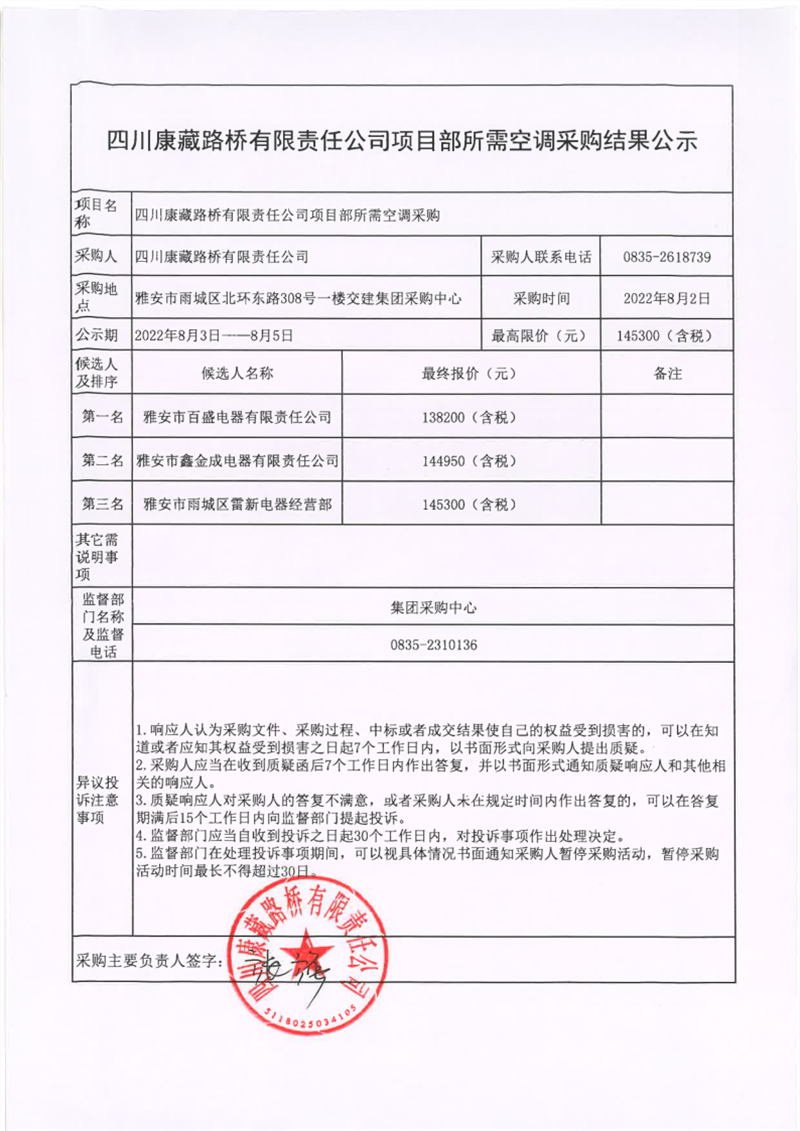 四川康藏路橋有限責(zé)任公司項目部所需空調(diào)采購結(jié)果公示