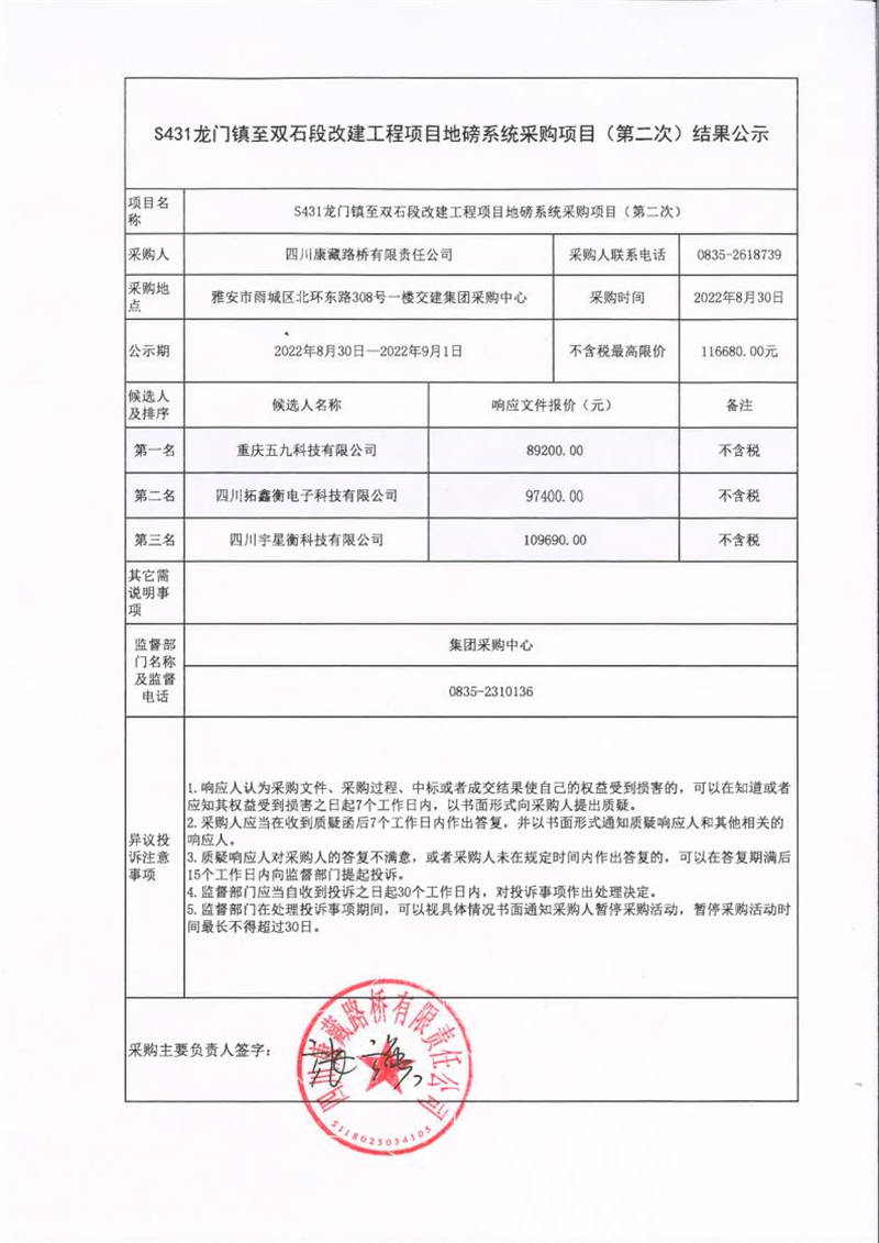 四川康藏路橋有限責任公司S431龍門鎮(zhèn)至雙石段改建工程項目地磅系統(tǒng)采購項目(第二次)結(jié)果公示