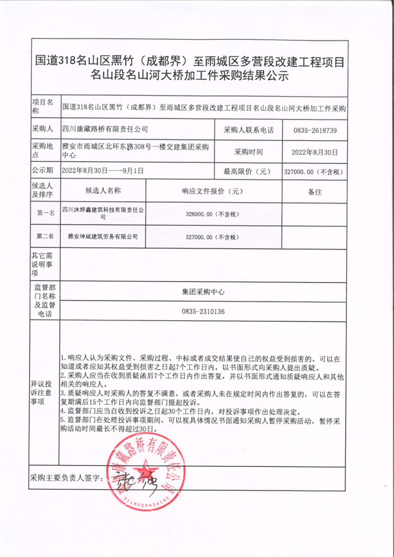 四川康藏路橋有限責任公司國道318名山區(qū)黑竹(成都界)至雨城區(qū)多營段改建工程項目名山段名山河大橋加工件采購結(jié)果公示