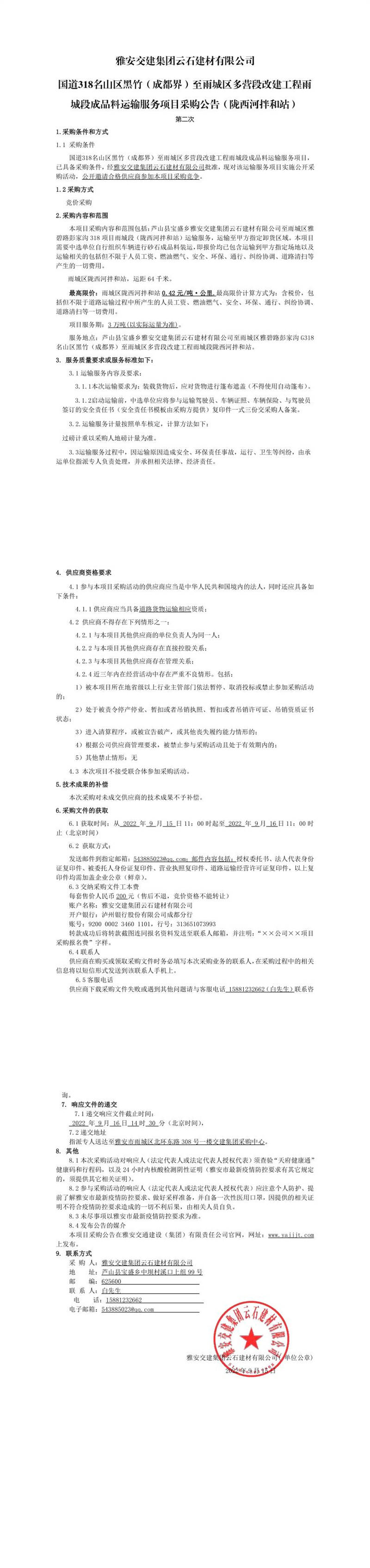 雅安交建集團(tuán)云石建材有限公司國(guó)道318名山區(qū)黑竹(成都界)至雨城區(qū)多營(yíng)段改建工程名山段成品料運(yùn)輸服務(wù)項(xiàng)目采購(gòu)公告(皇茶大道拌和站)