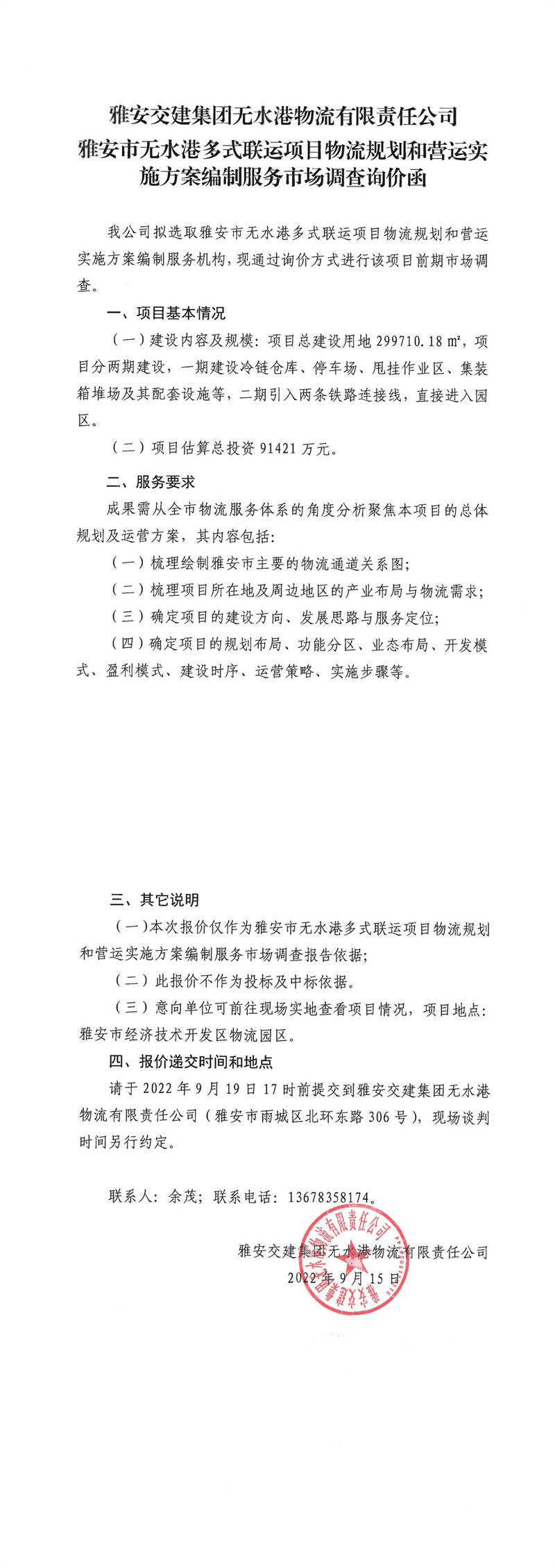 雅安交建集團無水港物流有限責任公司雅安市無水港多式聯(lián)運項目物流規(guī)劃和營運實施方案編制服務(wù)市場調(diào)查詢價函