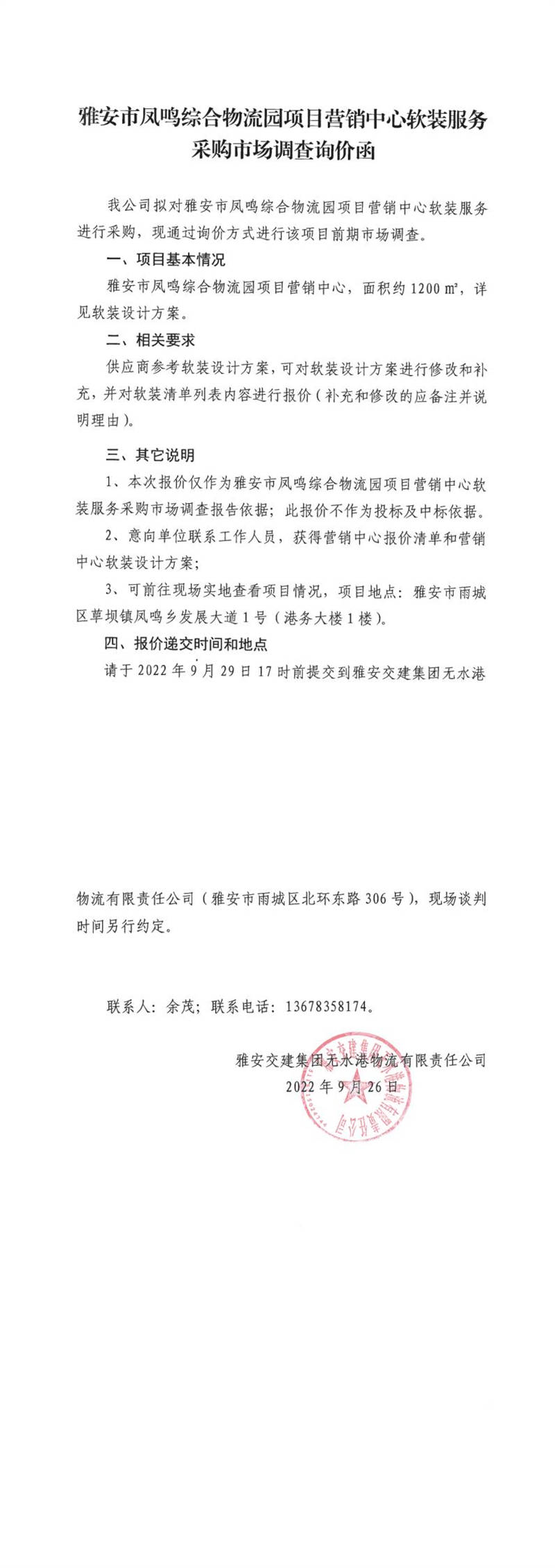 雅安交建集團無水港物流有限責(zé)任公司雅安市鳳鳴綜合物流園項目營銷中心軟裝服務(wù)采購市場調(diào)查詢價函