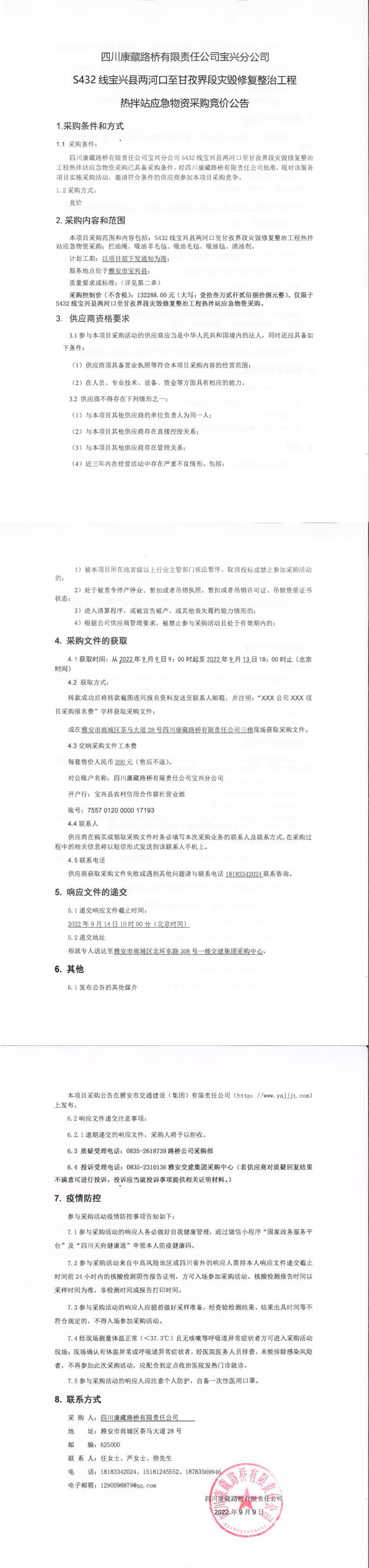 四川康藏路橋有限責(zé)任公司S432線寶興縣兩河口至甘孜界段災(zāi)毀修復(fù)整治工程熱拌站應(yīng)急物資采購競價(jià)公告