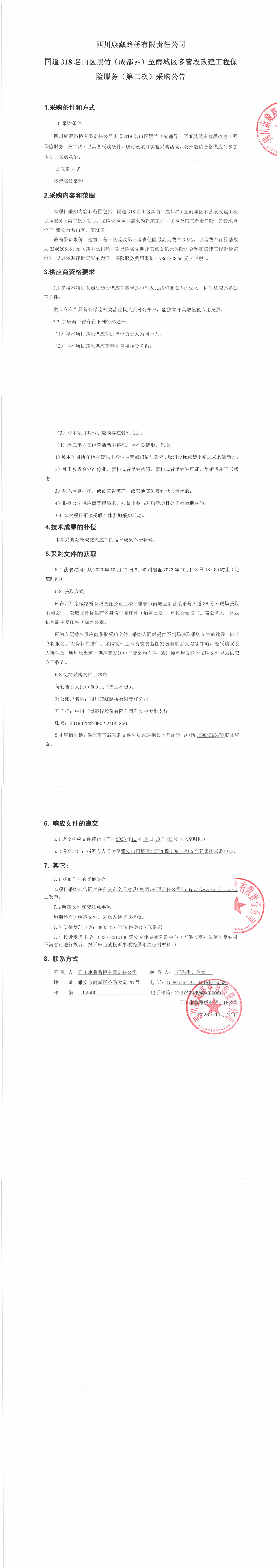 四川康藏路橋有限責任公司國道318名山區(qū)黑竹(成都界)至雨城區(qū)多營段改建工程保險服務(第二次)采購公告