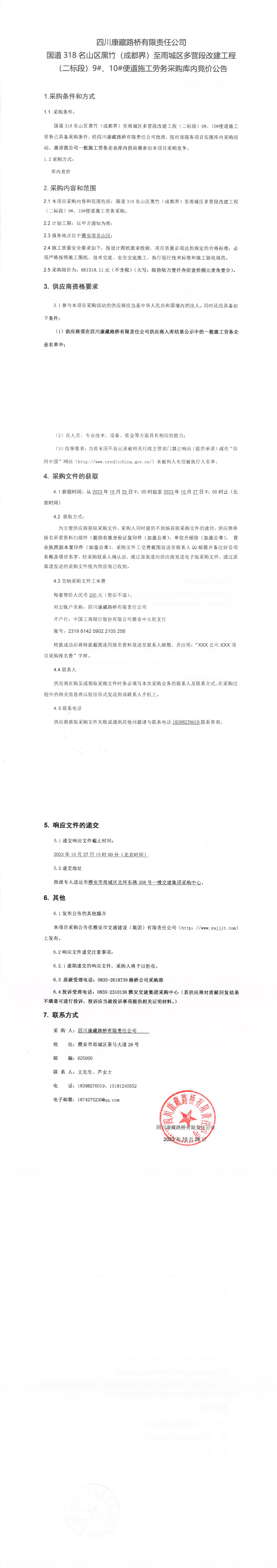 四川康藏路橋有限責(zé)任公司國(guó)道318名山區(qū)黑竹(成都界)至雨城區(qū)多營(yíng)段改建工程(二標(biāo)段)9#、10#便道施工勞務(wù)采購(gòu)庫(kù)內(nèi)競(jìng)價(jià)公告