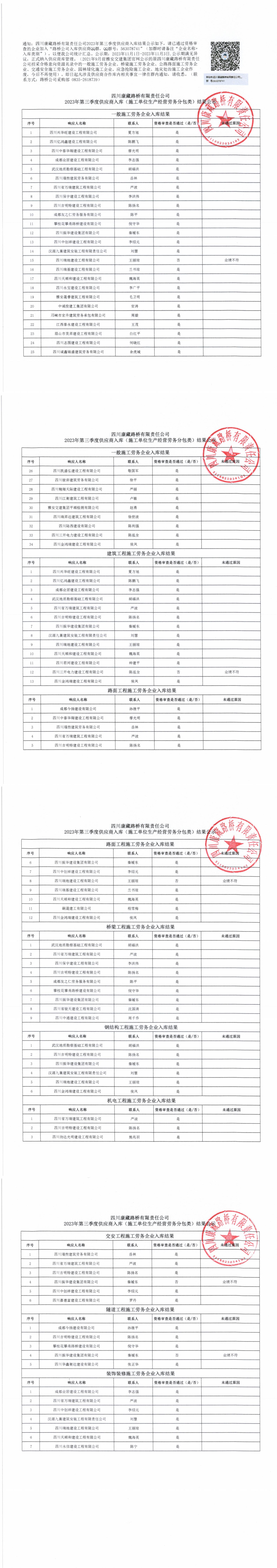 四川康藏路橋有限責(zé)任公司2023年第三季度供應(yīng)商入庫(kù)(施工單位生產(chǎn)經(jīng)營(yíng)勞務(wù)分包類)結(jié)果公示