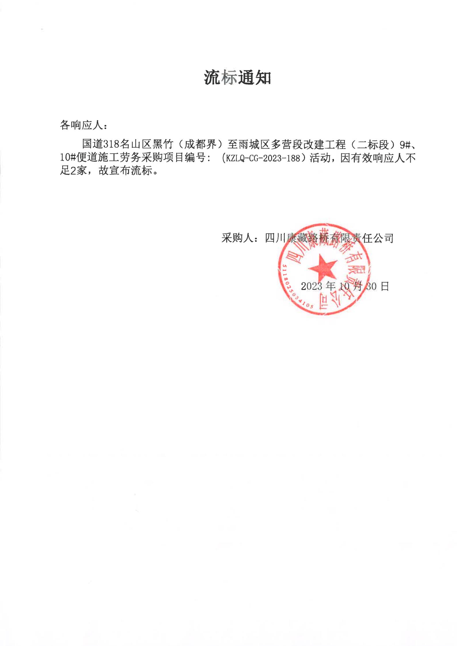 四川康藏路橋有限責任公司國道318名山區(qū)黑竹(成都界)至雨城區(qū)多營段改建工程(二標段)9#、10#便道施工勞務(wù)采購流標通知