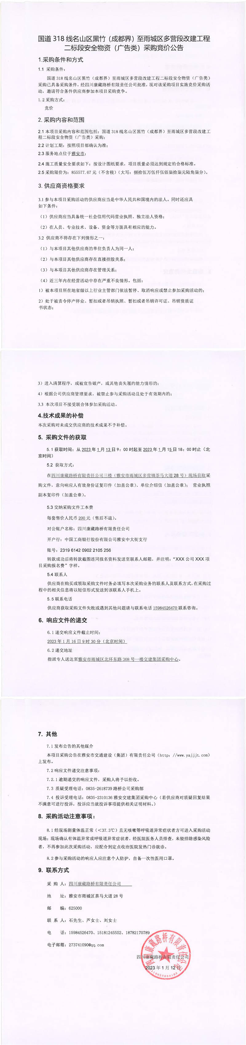 四川康藏路橋有限責(zé)任公司國道318線名山區(qū)黑竹(成都界)至雨城區(qū)多營段改建工程二標(biāo)段安全物資(廣告類)采購競價(jià)公告