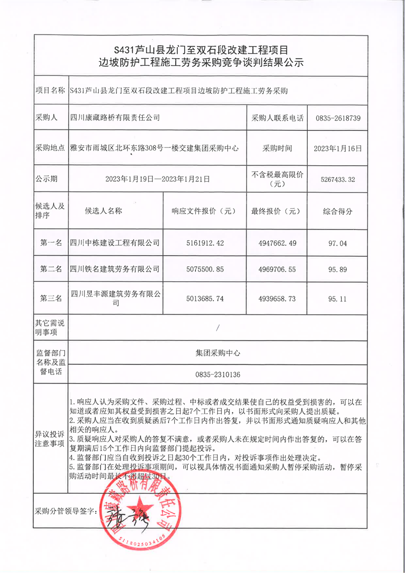 四川康藏路橋有限責(zé)任公司S431蘆山縣龍門至雙石段改建工程項(xiàng)目邊坡防護(hù)工程施工勞務(wù)采購競(jìng)爭談判結(jié)果公示