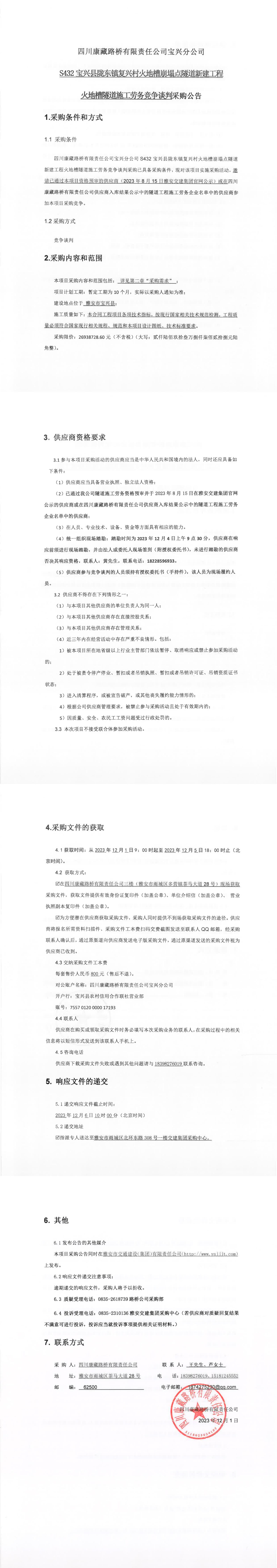 四川康藏路橋有限責(zé)任公司寶興分公司S432寶興縣隴東鎮(zhèn)復(fù)興村火地槽崩塌點隧道新建工程火地槽隧道施工勞務(wù)競爭談判采購公告