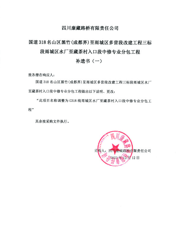 四川康藏路橋有限責(zé)任公司國道318名山區(qū)黑竹(成都界)至雨城區(qū)多營段改建工程三標(biāo)段雨城區(qū)水廠至藏茶村入口段中修專業(yè)分包工程(補遺書一)
