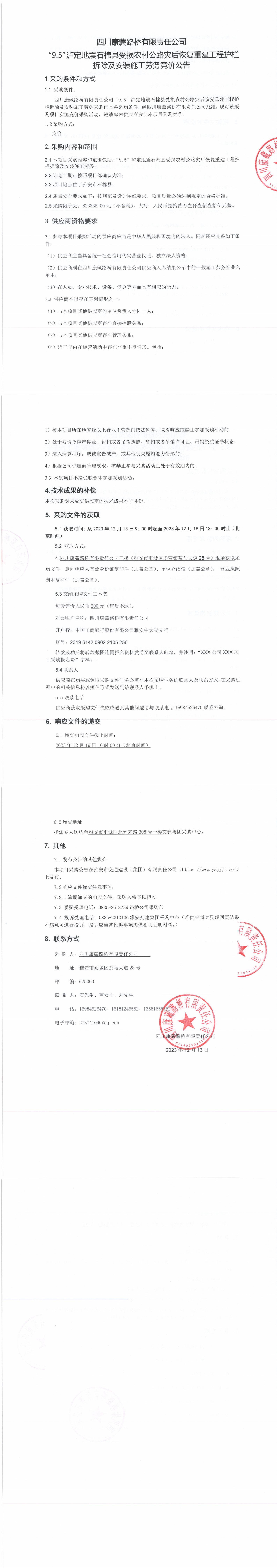 四川康藏路橋有限責任公司“9.5”瀘定地震石棉縣受損農(nóng)村公路災后恢復重建工程護欄拆除及安裝施工勞務(wù)競價公告