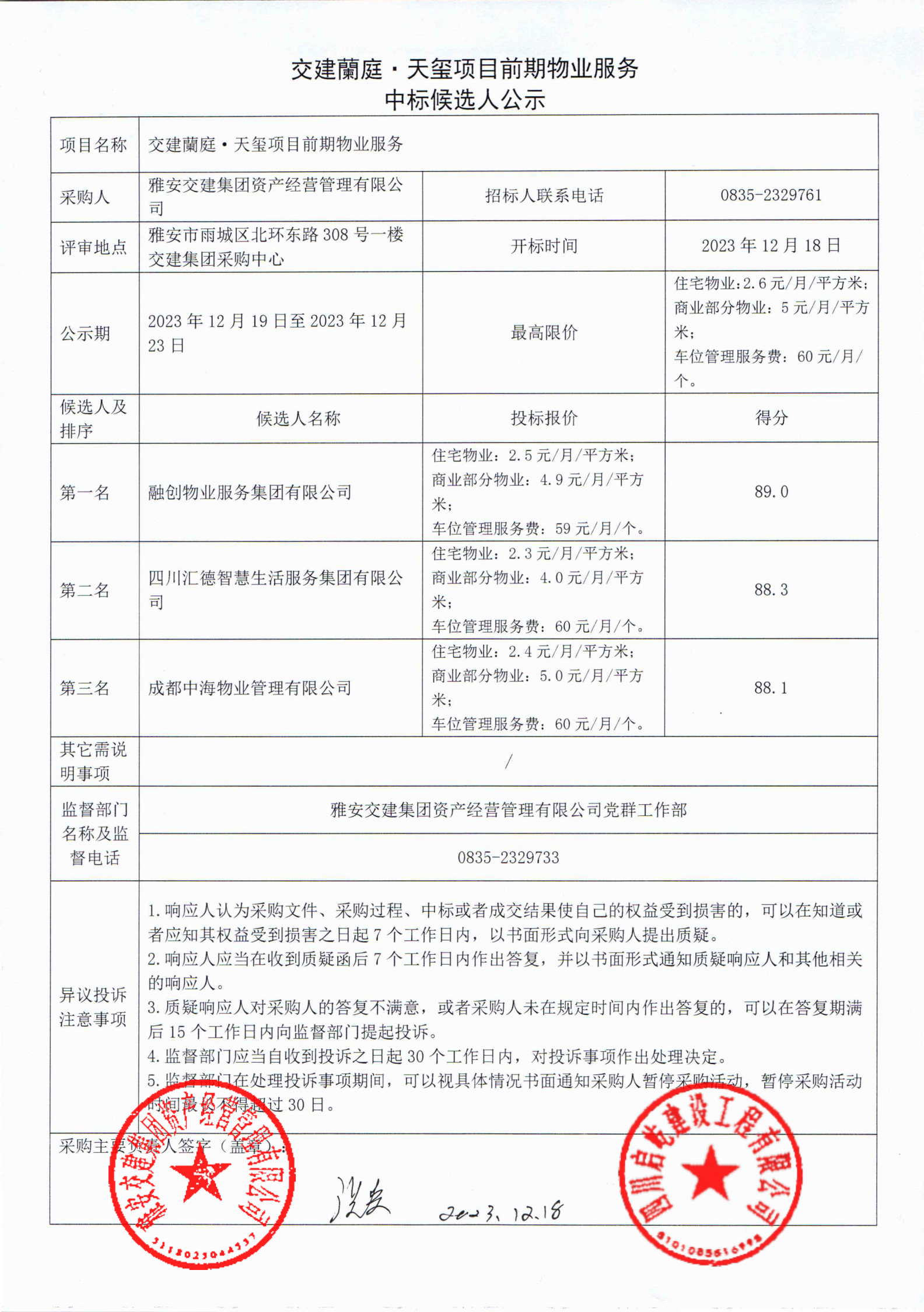 雅安交建集團資產經(jīng)營管理有限公司交建蘭庭·天璽項目前期物業(yè)服務中標候選人公示