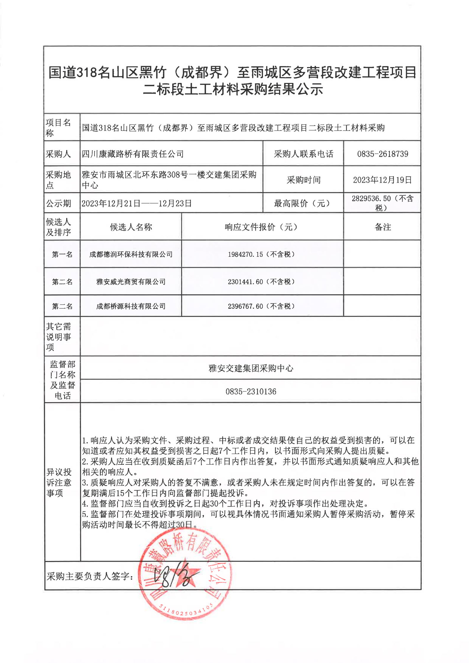 四川康藏路橋有限責(zé)任公司國(guó)道318名山區(qū)黑竹(成都界)至雨城區(qū)多營(yíng)段改建工程項(xiàng)目二標(biāo)段土工材料采購(gòu)結(jié)果公示