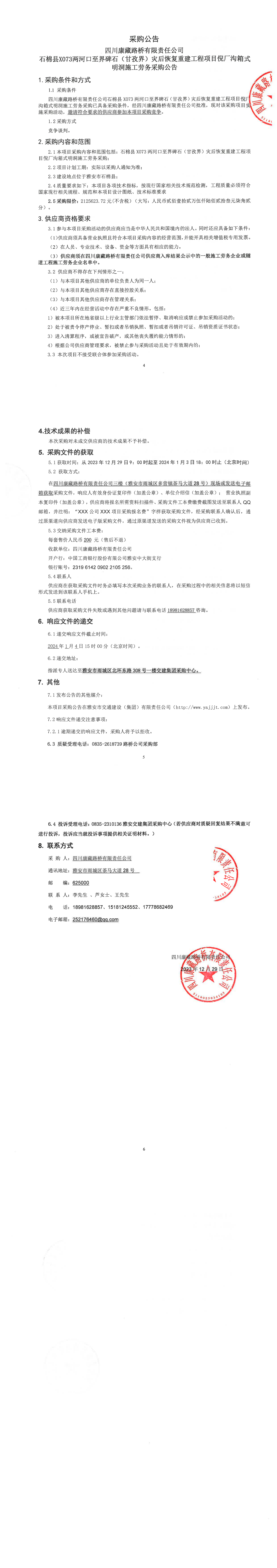 四川康藏路橋有限責(zé)任公司石棉縣X073兩河口至界碑石(甘孜界)災(zāi)后恢復(fù)重建工程項(xiàng)目倪廠溝箱式明洞施工勞務(wù)采購公告