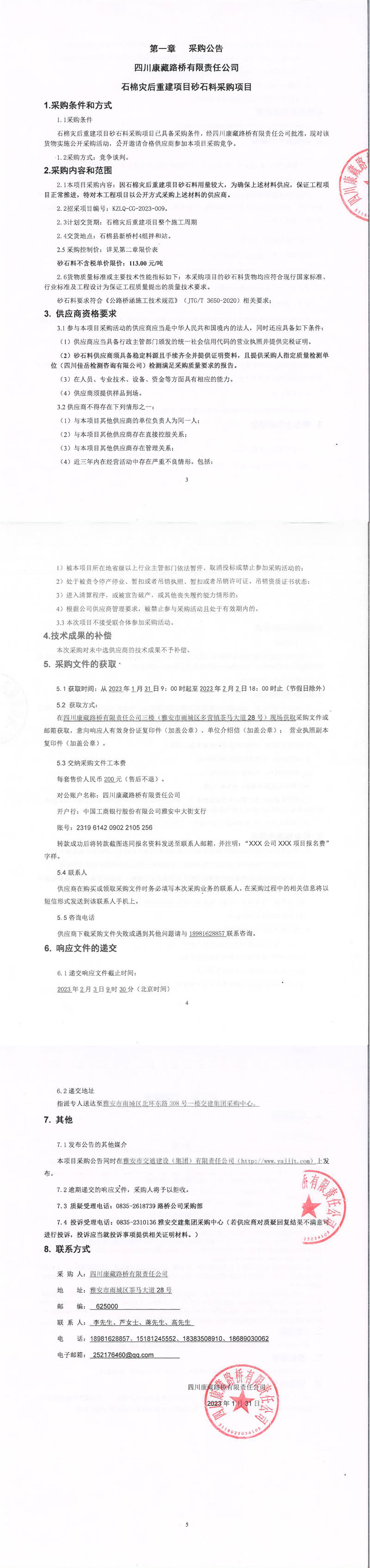 四川康藏路橋有限責任公司石棉災(zāi)后重建項目砂石料采購項目采購公告