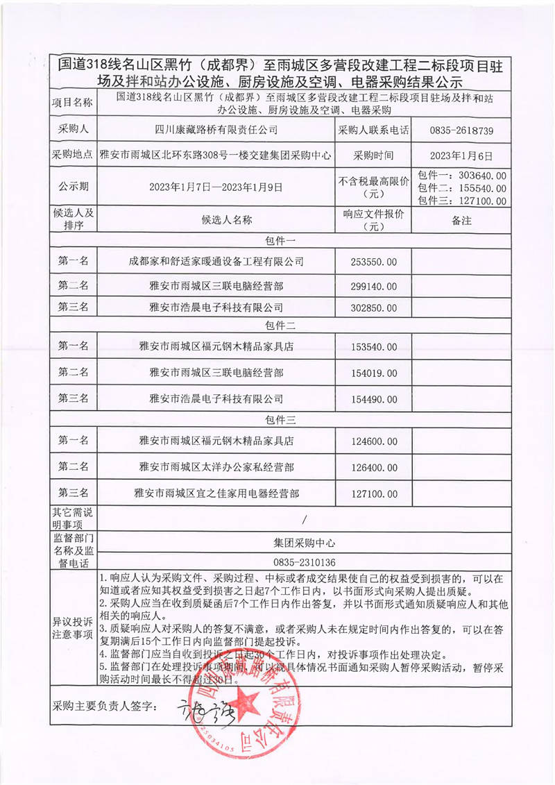 四川康藏路橋有限責(zé)任公司國道318線名山區(qū)黑竹(成都界)至雨城區(qū)多營段改建工程二標(biāo)段項目駐場及拌和站辦公設(shè)施、廚房設(shè)施及空調(diào)、電器采購結(jié)果公示