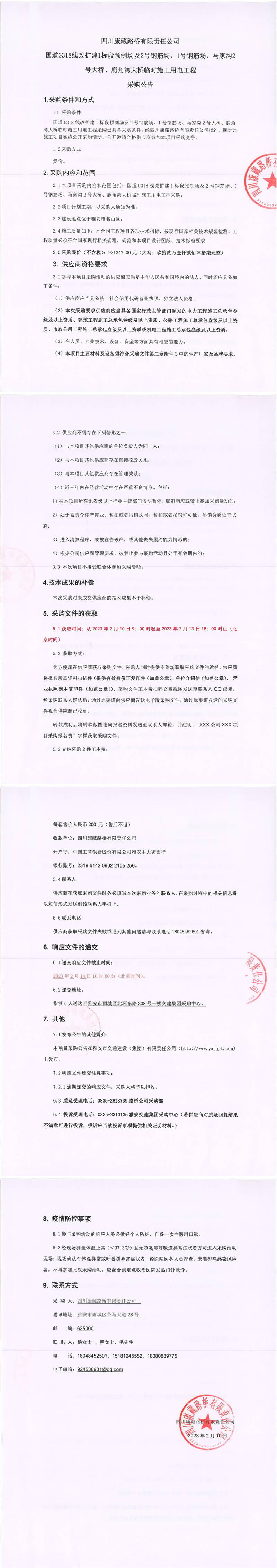 四川康藏路橋有限責(zé)任公司國道G318線改擴(kuò)建1標(biāo)段預(yù)制場及2號(hào)鋼筋場、1號(hào)鋼筋場、馬家溝2號(hào)大橋、鹿角灣大橋臨時(shí)施工用電工程采購公告