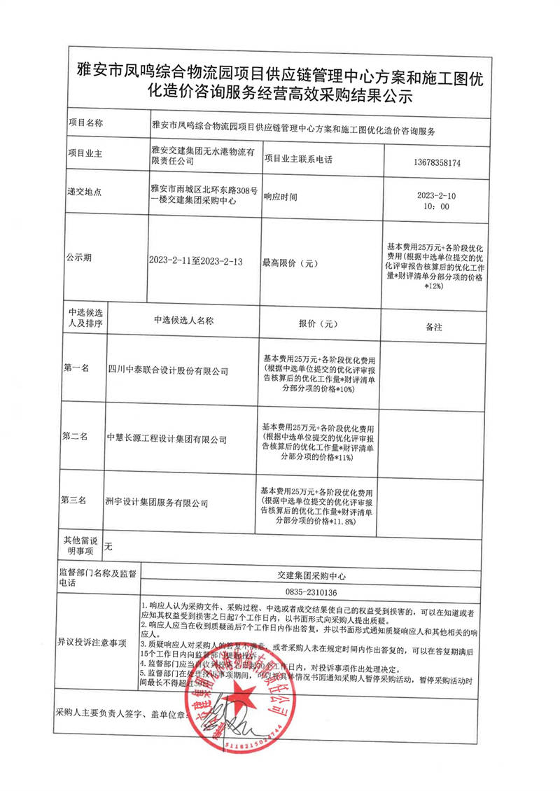 雅安交建集團無水港物流有限責(zé)任公司雅安市鳳鳴綜合物流園項目供應(yīng)鏈管理中心方案和施工圖優(yōu)化造價咨詢服務(wù)經(jīng)營高效采購結(jié)果公示