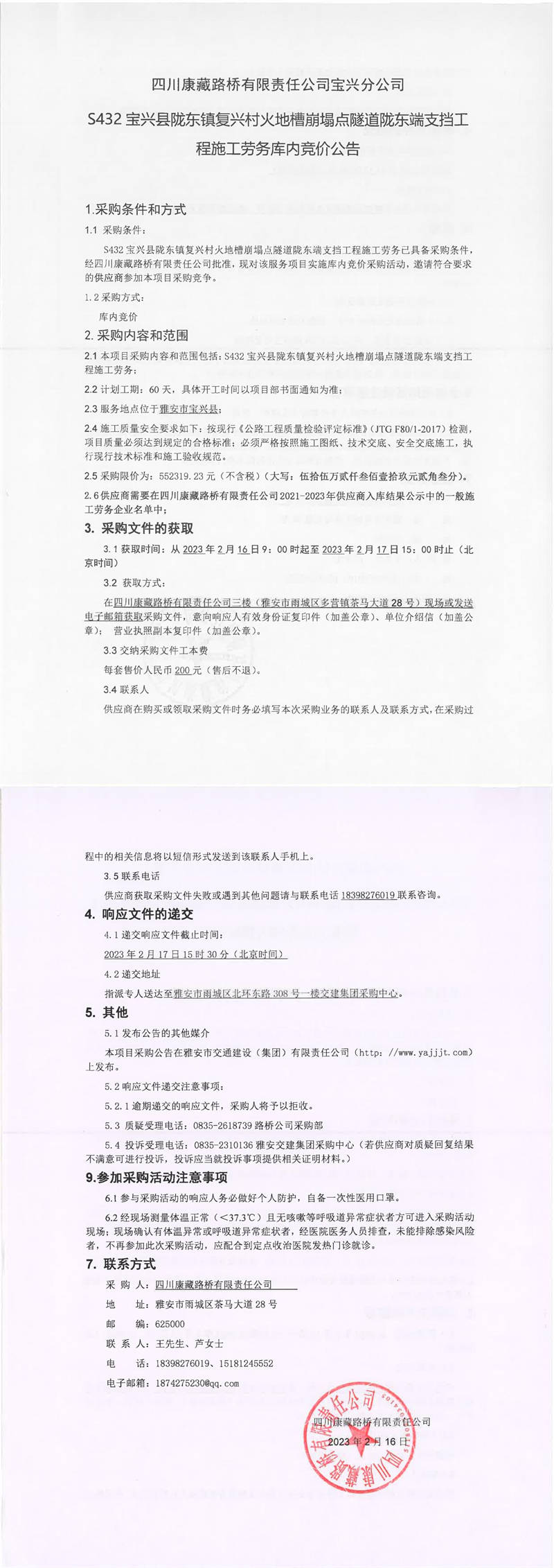 四川康藏路橋有限責(zé)任公司寶興分公司S432寶興縣隴東鎮(zhèn)復(fù)興村火地槽崩塌點(diǎn)隧道隴東端支擋工程施工勞務(wù)庫內(nèi)競價(jià)公告