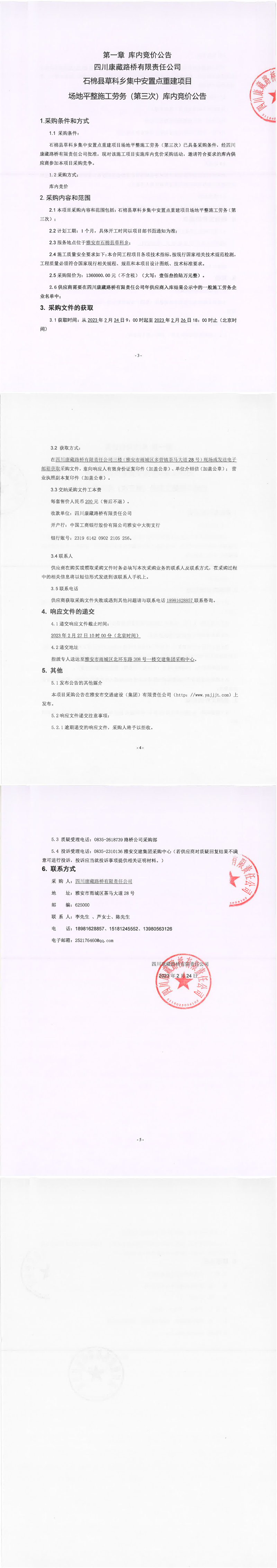 四川康藏路橋有限責(zé)任公司石棉縣草科鄉(xiāng)集中安置點(diǎn)重建項(xiàng)目場地平整施工勞務(wù)(第三次)庫內(nèi)競價