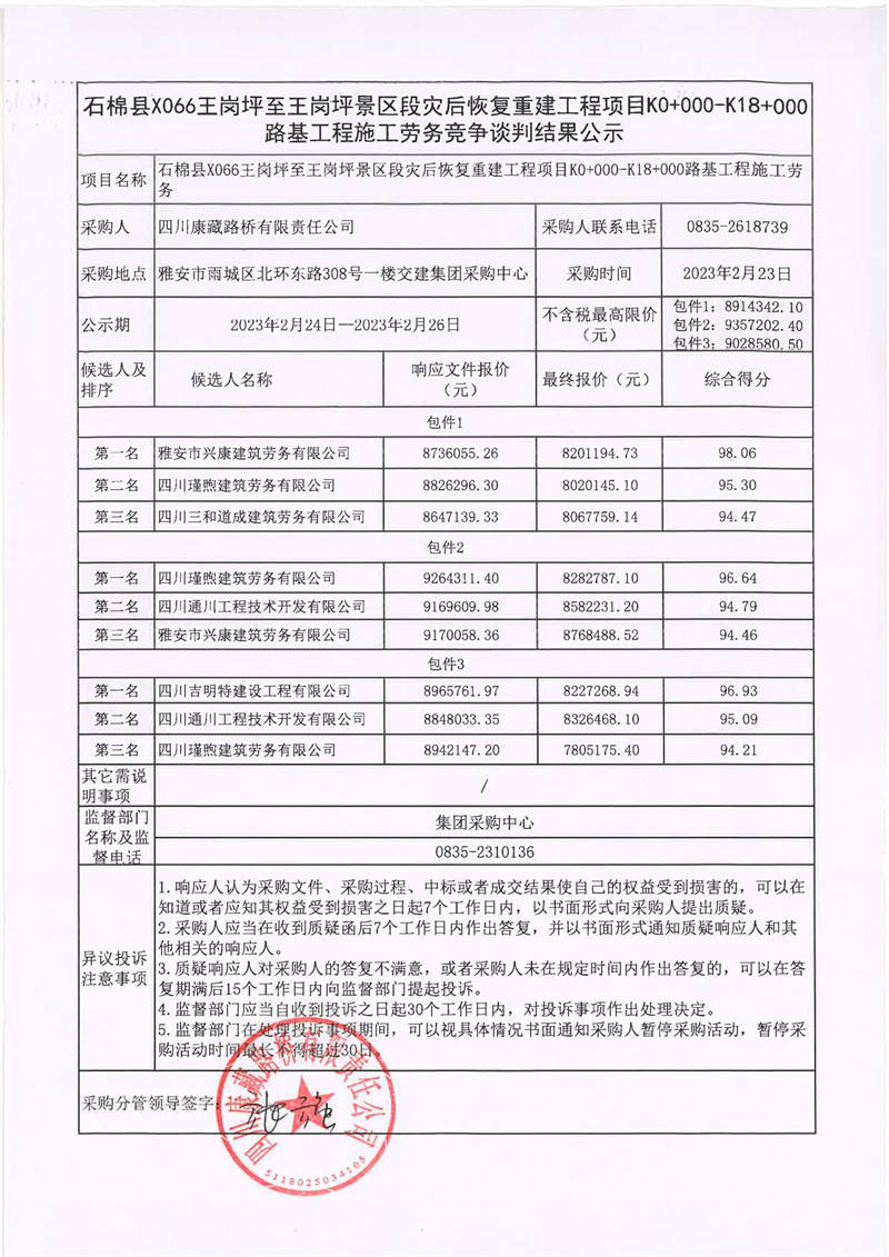 四川康藏路橋有限責(zé)任公司石棉縣X066王崗坪至王崗坪景區(qū)段災(zāi)后恢復(fù)重建工程項(xiàng)目土石方工程、排水工程、邊坡治理工程、防護(hù)工程施工勞務(wù)采購(gòu)項(xiàng)目競(jìng)爭(zhēng)談判結(jié)果公示
