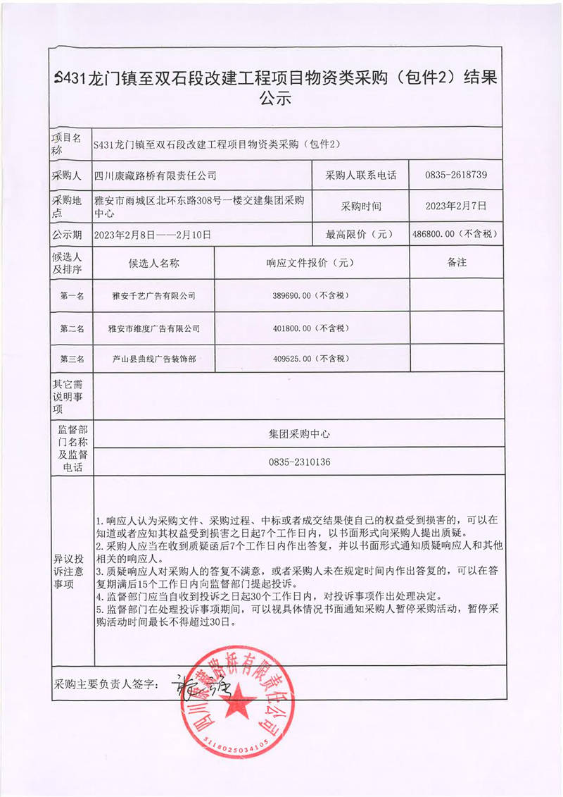 四川康藏路橋有限責(zé)任公司S431龍門(mén)鎮(zhèn)至雙石段改建工程項(xiàng)目物資類(lèi)采購(gòu)(包件1、包件2)結(jié)果公示